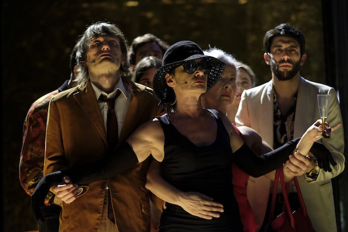 Poi c’è naturalmente Trimalchione (Antonino Iuorio), perfetto stereotipo del grasso ignorante arricchito: infanzia “difficile” a far “servizi” al padrone e alla padrona, una iniziale disponibilità economica che investe in navi, e poi navi, e poi ancora navi. I soldi non servono, dice lui, per comprare case e vita agiata, sesso e buona cucina: il denaro è importante in sé, il denaro, anzi, è tutto, il resto – non ho mai letto un filosofo in vita mia – sono solo sciocchezze. Quando, per ravvivare la festa, Trimalchione inscena il suo funerale, immagini già che, al contrario del suo omonimo latino, questo nostro contemporaneo andrà fino in fondo, si taglierà sul serio le vene, come se le tagliò sul serio il suo creatore Petronio, in un vago impeto di pietà per se stesso o forse, non so, di paradossale, e apparentemente incongrua, riaffermazione di vitalità.