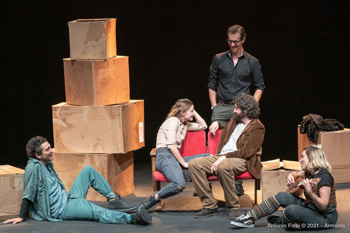 Funzionale e simbolica la scelta di una scenografia basilare: sul palco vediamo un divano circondato da diversi scatoloni, che nell’azione sono utilizzati sia come contenitori, sia come sedute per gli attori, ma rievocano anche la precarietà e la trascuratezza della vita vissuta al dal protagonista.