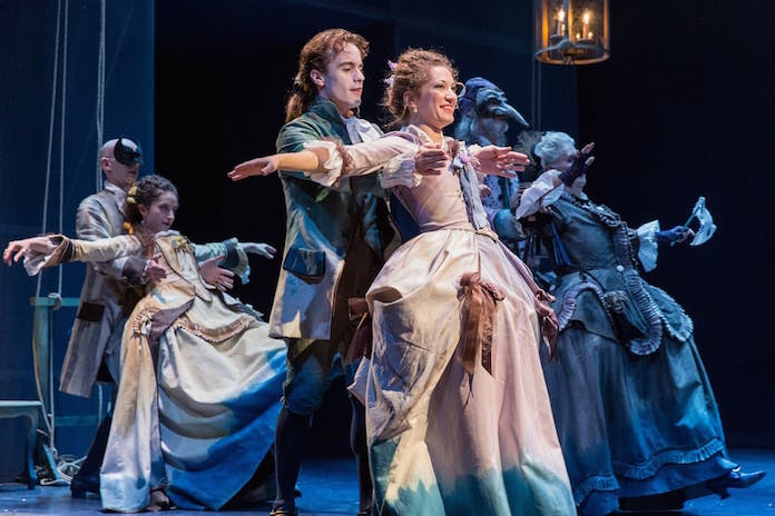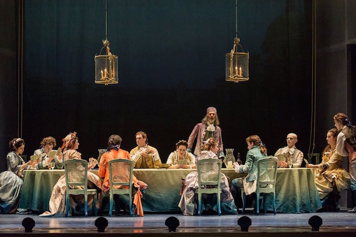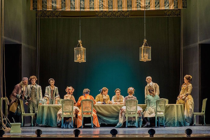 Risuona chiara e forte, la voce d’un Eduardo non ancor vecchio – la registrazione è del 1954, prima d’una Miseria e nobiltà milanese con Luca esordiente come Peppeniello – nella sala del Teatro Mercadante, a traghettare il pubblico napoletano verso il “dialetto antico” di Una delle ultime sere di Carnovale, per la regia di Beppe Navello; e in effetti, benché possa apparire inconsueta, a taluni addirittura bizzarra, la scelta di recitare nella lingua di Goldoni – e passi – senza nemmeno l’ausilio dei sovratitoli cui il pubblico è ormai avvezzo, è tuttavia da considerare come basti adeguarsi al saggio consiglio d’Eduardo per passar la prova non solo indenni, ma traendo il massimo piacere da questa commedia dall’aria leggera e mite come un anticipo di primavera o, meglio, un ultimo scampolo di sole ad ottobre inoltrato, prima che venga l’inverno.