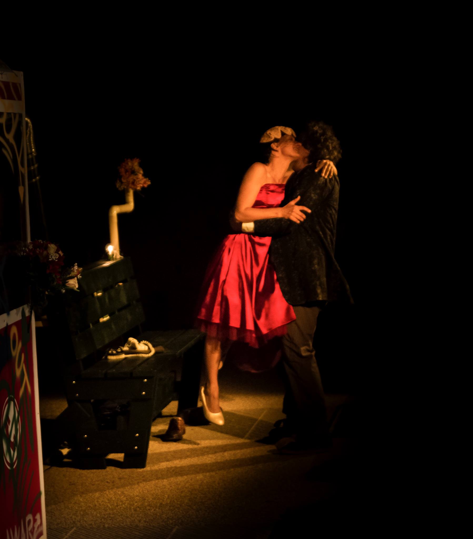 Qualcosa non è andato come da copione, in questa versione, poiché gli eroi, lungi dall’essere morti secondo le dinamiche che tutti conosciamo, sono marito e moglie e il pubblico che giunge al Lux di Pisa li coglie in un risveglio mattutino qualunque. Non più adolescenti, non più sommersi dai versi di Shakespeare, impossessati da rime di dolore o mangiati dal mito degli amanti separati, ma una coppia datata, più o meno felice. Non si comprende a pieno chi siano qui Romeo e Giulietta, che lavoro facciano, se siano fantasmi o ologrammi in attesa di “provare a morire”, ogni giorno, e dare spettacolo. Forse sono essi stessi attori, o concetti in un corpo, macchiette impregnate di una stanca voglia di amare.