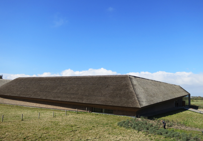 L’architettura, la cui forma ricorda un’antica dimora vichinga, sembra emergere dal suolo, in un dialogo costante con la natura circostante, grazie anche ai materiali locali adottati, come la paglia, essiccata in loco e impregnata di sale marino.