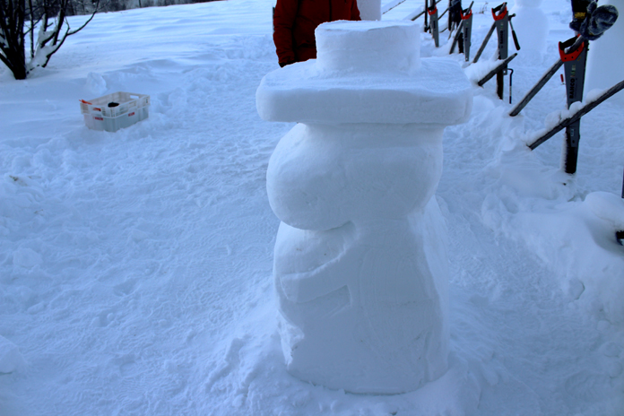 Riscaldati gli animi, usciamo per dar corpo al nostro estro: in uno spazio aperto, con circa -20°, ci attendono blocchi di ghiaccio e arnesi da scultori. Pauliina ci spiega come utilizzare carboncino, sega, picchetto e guanti per modellare il ghiaccio, quindi ci lascia liberi di sfogare la nostra creatività.