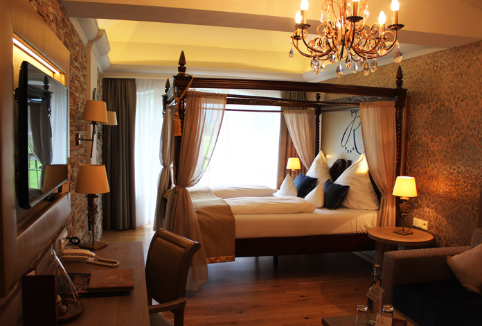 La struttura 4 stelle superior offre camere piene di comfort, arredate con stile, tra particolari regali ed eleganti e punte ‘alpine’, dove l’oro si sposa con il legno, la pelle e la pietra, il bagno è di un moderno design ed ai piedi del letto riscalda anima e corpo un caminetto elettrico. Ciò che lascia senza parole è la vista sui castelli, vero tableau vivant. Ma l’hotel nasconde anche altre meraviglie.