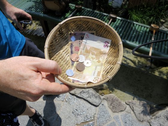 Prima di abbandonare la collina, una tappa obbligatoria è al tempio sottostante Sanko Inari Shrine per il tradizionale ‘lavaggio del denaro’: si tramanda che chiunque accenda una candela da 100 yen al santuario e lavi del denaro nell’acqua sacra, verrà ricompensato ottenendo la moltiplicazione del denaro lavato.