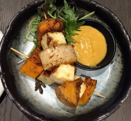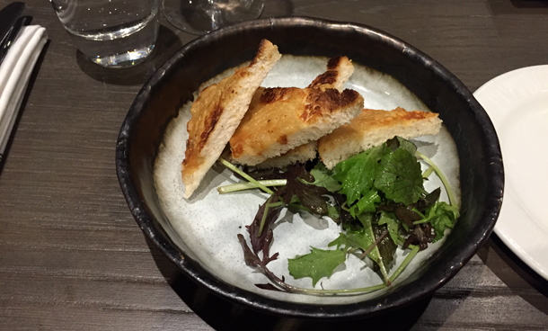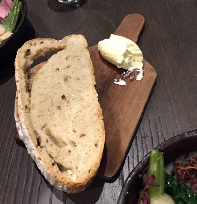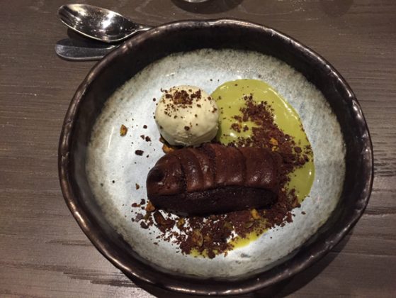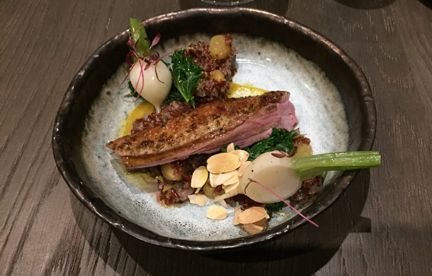 Dopo la sorpresa dell’aperitivo, ci attende la cena nel ristorante, uno spazio informale ma attento, con muri in pietra, tavoli di legno, arredamento minimal e parquet. La cena inizia dagli antipasti, tra tradizione e innovazione, come il toast robusto con formaggio delle Cotswolds e lo squisito pane fresco con burro salato, fino agli spiedini di zucca, il tutto accompagnato da un buon rosé. Per secondo petto d’anatra con riso, uvetta e mandorle tostate, molto fine e ricercato. Si conclude con un pudding al cioccolato, gelato al caffè e crema di pistacchio, la cui vista supera in realtà la prova del gusto. Una cena ricercata, ma dalle porzioni molto piccole, sia per gli starters che per i mains.