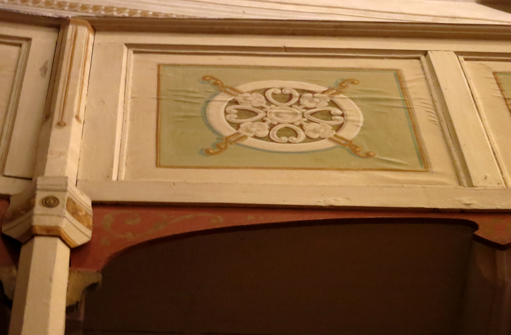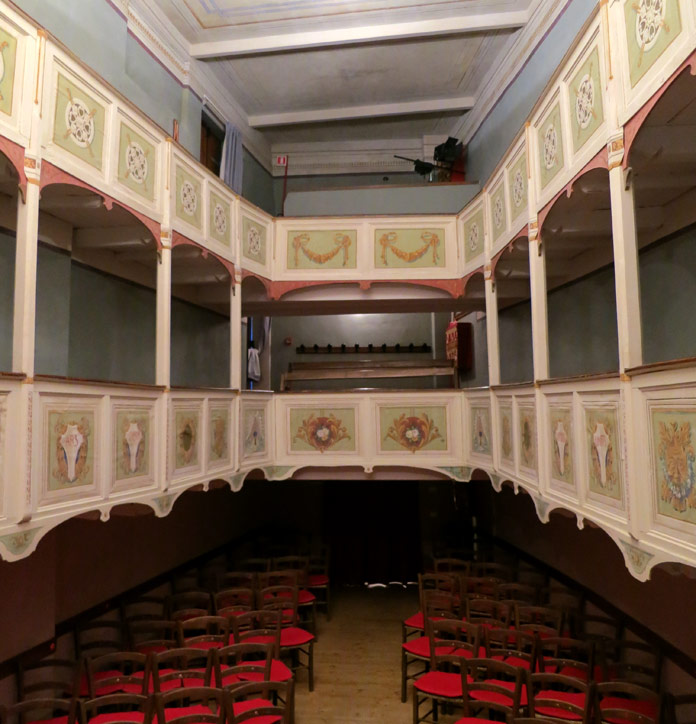 Un’invidia comprensibile appena valicato il piccolo sipario che ci separa dalla platea: su una struttura lignea perfettamente restaurata si ergono due ordini di palchi, dipinti, secondo la tradizione, da due pittori dei Bagni di Lucca e Spezia. Un teatro all’italiana in miniatura, di una grazia che lo rende inimitabile. Cristina ci narra un simpatico aneddoto: un giorno il pittore dei Bagni di Lucca, amante dei Necci (dolce tipico toscano realizzato con la farina di castagne), affermò che in base a quanti Necci avrebbe mangiato quel giorno, avrebbe disegnato tanti cerchi. Ed i cerchi del II ordine sono addirittura 14!