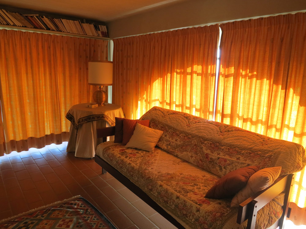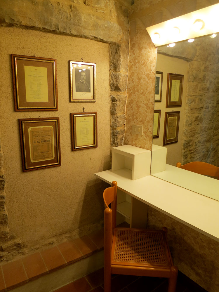 Scendendo una stretta scala, ci immergiamo in una nuova dimensione, fatta di un accogliente salotto con divano, illuminato da grandi vetrate, la sartoria, con tutto l’occorrente per i costumi di scena, due bagni muniti di doccia e due camerini, il tutto intagliato nella pietra viva: non manca davvero niente!