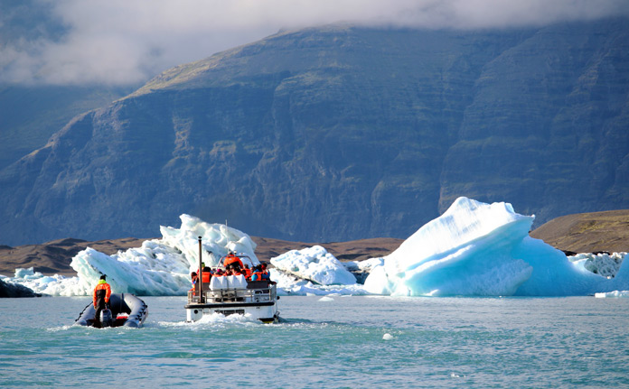Prima meta la minore delle lagune ma non meno affascinante, la Fjallsarlon, i cui iceberg navigano placidamente proprio di fronte al possente ghiacciaio, scambiandosi trasparenze e abbagli. Quindi arriviamo alla maggiore Jökulsarlon e restiamo letteralmente incantati ad ammirare i 25mq di laguna sulla cui superficie galleggiano spettacolari iceberg. Montiamo sull’Amphibian Boat per un tour semplicemente unico tra gli azzurri giganti striati di nero, assaggiando il ghiaccio antico, ammaliati dalle figure incantate che emergono dai ghiacci, col volto sferzato dal vento, il sole riflesso a filo d’acqua, e le sterne in volo sopra di noi.