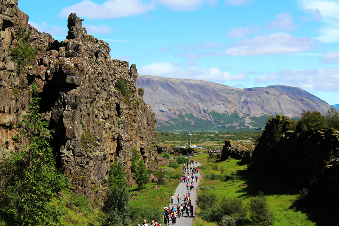 Salutiamo con nostalgia l’artistico Kalli’s Apartment e presa la macchina da Thrifty Car rental, partiamo on the road su una splendida Ford Kuga 4×4 cambio automatico, con wifi interno e navigatore: la nostra nuova casa! Destinazione della giornata: il Circolo d’Oro. 20 gradi e uno splendido sole ci accompagnano alla scoperta della prima meta: il Parco Nazionale di Pingvellir, Patrimonio dell’Umanità, sito storico più importante d’Islanda, sede dell’antico Parlamento islandese, l’Alpingi, primo Parlamento democratico del mondo. Qui si incontrano la placca tettonica nordamericana e quella euroasiatica, dando origine ad una splendida vallata verde con fiumi, il grande lago Pingvallavatn e meravigliose cascate. Il parcheggio costa circa 5 euro, bagno a pagamento (pagabile anche con bancomat!).