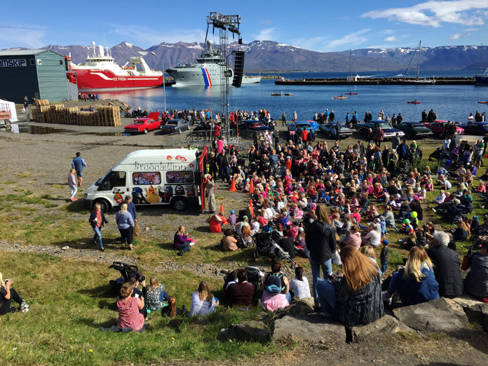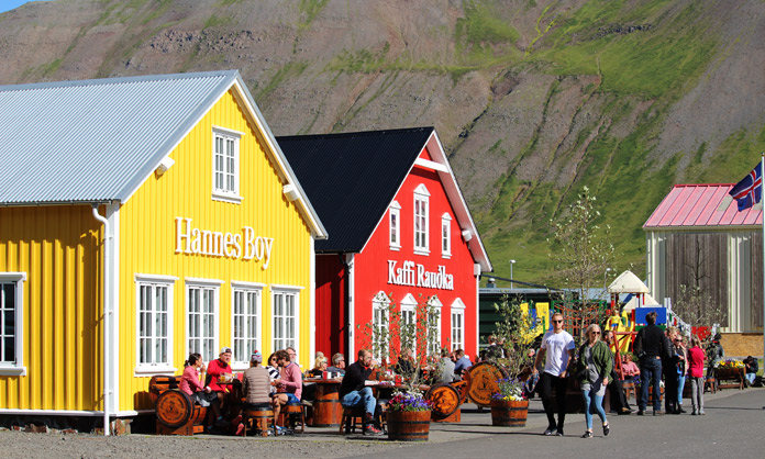 Salutiamo Pavle e Sonja che, con il loro piccolo bimbo, si prendono cura degli ospiti del Raven Hill Lodge con una gentilezza unica, per catapultarci nella festa più importante dell’estate islandese: il Great Fish Day di Dalvik. Qui i produttori di pesce ed altre importanti società, la più grande della quali è la Samskip, organizzano sul porto ogni secondo weekend di agosto una grande abbuffata di pesce per tre giorni, dalle 11 alle 17, gratuita per tutti i visitatori. Ci ritroviamo così circondati da banchi che offrono hamburger di pesce, pesce secco, sushi, pesce fritto, zuppe di pesce, insomma pesce in tutte le salse fino a bibite aromatizzate, caffè, gelato e gadget tra palchi dove si esibiscono giovani cantanti e spettacoli per bambini, con sullo sfondo l’acqua azzurra dell’oceano e alle spalle montagne innevate: un’esperienza sensazionale e inebriante! Un consiglio: arrivate presto, prima di mezzogiorno, per evitare file chilometriche per accaparrarvi il vostro pasto. Anche il villaggio partecipa con gioia a questa festa e le case si addobbano con pupazzi di vecchi marinai, reti da pesca, troll e folletti. Se trovate un palloncino alla porta, bussate ed entrate: vi verrà offerta una squisita zuppa di pesce!