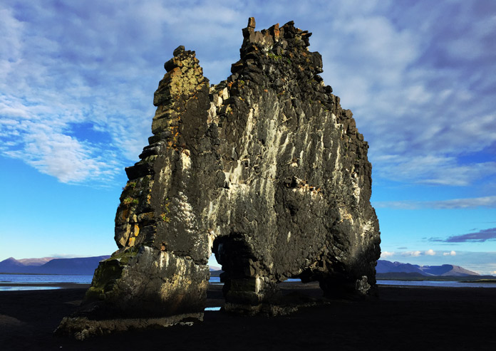 Nel tardo pomeriggio visitiamo l’Hvítserkur, il possente faraglione dalla forma di Elefante, sulla costa orientale della penisola di Vatnsnes: in realtà, secondo la leggenda, sarebbe un troll pietrificato dalla prima luce dell’alba mentre tentava di distruggere il monastero di Pingeyrar. Con la bassa marea, potrete toccargli le mastodontiche zampe ricoperte da alghe e conchiglie, passeggiare ai suoi piedi, raccogliere conchiglie sulla nera spiaggia su cui poggia. Non dimenticate, guardando il faraglione, di dirigervi alla sua destra, dalla spiaggia o attraverso un breve sentiero: spesso, da quelle parti, riposano cullate dagli ultimi raggi di sole, sul bagnasciuga, colonie di foche, che si crogiolano indisturbate, tra comiche e inverosimili pose da vere equilibriste. Uno spettacolo da non lasciarsi scappare!