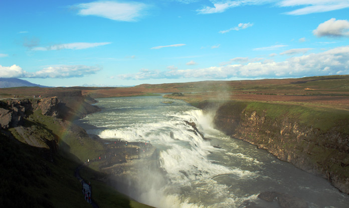 Ultima tappa della giornata Gullfoss, la cascata più famosa d’Islanda con il suo spettacolare doppio salto di 32 metri che la fa precipitare in una stretta e profonda gola che si spalanca nell’altipiano: la sua potenza (portata media di circa 140 m³/s in estate e 80 m³/s in inverno) e bellezza lascia senza fiato.
