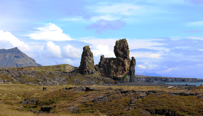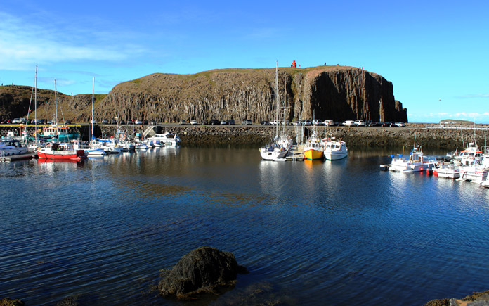 Circa 2 km a sud, scendiamo verso il faro di Malarrif, da cui si possono ammirare gli straordinari pinnacoli rocciosi di Londrangar, ovvero la chiesa degli elfi, quindi proseguiamo verso Arnarstapi, dove svetta il monumento dedicato a Bardur, lo spirito guardiano della regione. Da qui partono numerose escursioni per il ghiacciaio Snaefellsjökull.