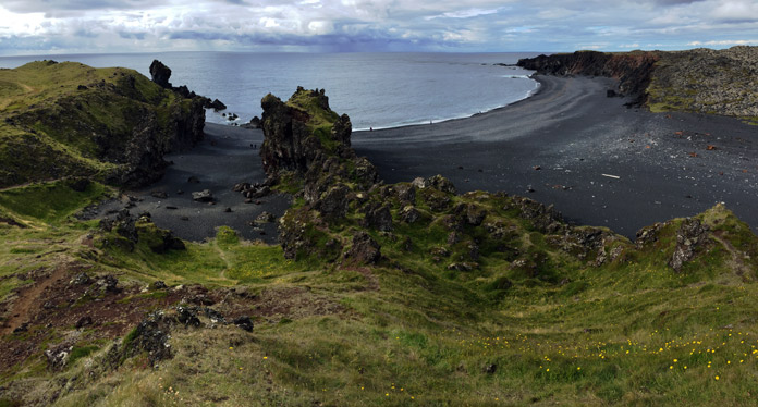 Proseguendo sulla 574 avvistiamo la spiaggia di sabbia nera di Djupalonssandur: con un breve percorso a piedi tra spettacolari formazioni rocciose, che comprendono una chiesa degli elfi e una troll femmina pietrificata, raggiungiamo la spiaggia cosparsa di pietre levigate dagli agenti atmosferici e dai resti del peschereccio Eding che qui fece un terribile naufragio. Al ritorno, testiamo la nostra forza con le famose 5 pietre da sollevamento utilizzate secondo la tradizione per scegliere i veri marinai che si sarebbero allontanati da Dritvik verso il mare aperto, passiamo sotto l’arco roccioso di Gatklettor e rimontiamo in macchina.