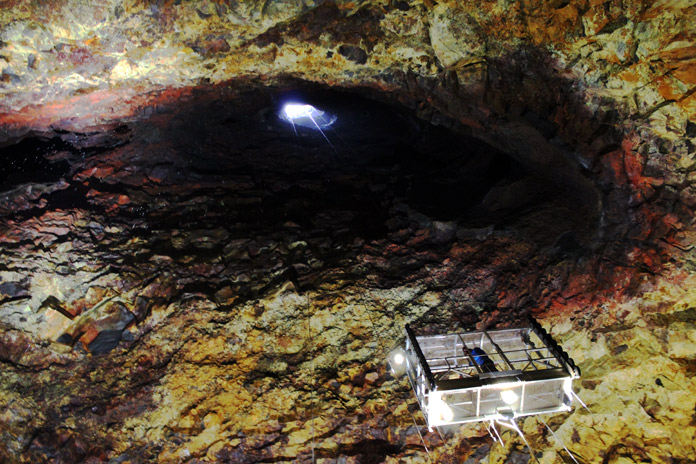 Finalmente raggiungiamo il rifugio ai piedi del vulcano: ci togliamo l’impermeabile, ci asciughiamo e riscaldiamo, quindi indossiamo un elmetto con luce e cablaggio di sicurezza e saliamo lungo la ripida scalinata che ci porta sulla cima del vulcano. Qui, messi in sicurezza con un’imbracatura, saliamo sull’ascensore aperto, collegato ad una gru, che lentamente, ci porta all’interno della camera magmatica, tra pareti cangianti, per 6 minuti di discesa fino a 120 m di profondità, nel cuore del vulcano preservatosi per oltre 4000 anni. Solitamente, dopo l’eruzione, la lava, raffreddandosi, chiude il cratere, ma nel vulcano Thrihnukagig il magma nella camera è del tutto scomparso, una cosa più unica che rara. Come veri speleologi, la visitiamo nei circa 30 minuti a disposizione, scrutandone ogni più piccolo e affascinante anfratto. Quindi ci imbrachiamo nuovamente e saliamo verso la superficie, passando per quella cavità di circa 4 × 4 m di larghezza che ne rappresenta il conico ingresso. Tornati al rifugio, ci rifocilliamo con una calda zuppa di carne, prima di riprendere il bagnato cammino verso l’autobus.