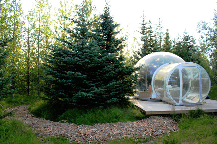 In serata, con il sole ancora alto, raggiungiamo il nostro memorabile rifugio della notte: il Buubble, l’hotel 5 milioni di stelle, ovvero una bolla incantata incastonata in uno boschetto di abeti. La struttura, davvero geniale, è quella di un igloo trasparente, in cui si entra con un sistema doppio di cerniere per evitare di disperdere l’aria al suo interno, proprio come un piccolo pallone aerostatico. Al suo interno, circondati da verdi abeti, cullati dal flebile cinguettio degli uccellini, con sopra di noi l’infinito blu del cielo, ci sdraiamo sul soffice letto, in un intimo ambiente minimal, con lampada di legno ed una piccola stufa elettrica. Per i bisogni primari, a pochi passi dalla bolla, dietro il profumato boschetto, una struttura di design, tutta in legno, con due bagni con docce, un tavolo ed una cucina, per gli ospiti. L’esperienza è davvero unica: per goderla appieno, d’estate, vi consigliamo di portarvi due mascherine per gli occhi, il sole si alza presto la mattina (verso le 4.00!).