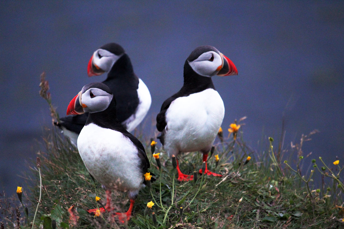 Svegli di buon’ora, ci dirigiamo subito all’atteso appuntamento con gli abitanti più buffi e popolari dell’isola: i puffin, sulla punta più meridionale, Storhofdi, la penisola rocciosa collegata all’isola da uno stretto istmo. Qui, muniti di fotocamera e scarpe da trekking, li inseguiamo su scogliere meravigliose, tra pascoli punteggiati di pecore, mentre le pulcinella di mare si librano e sbattono le ali con quel suono e gesto così inconfondibile, gettandosi sull’oceano o atterrando ‘comicamente’ sul ciglio erboso dei promontori: uno spettacolo meraviglioso, che ci incanta.