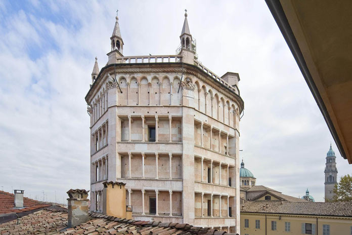 Appena fuori il Duomo di Parma si trova il Battistero, progettato da Benedetto Antelami e costruito tra il 1196 e il 1216, un esempio significativo del passaggio dal romanico al primo gotico. La struttura ottagonale, in marmo rosa di Verona, si sviluppa in altezza con quattro ordini di logge e tre portali. Al suo interno le linee sono slanciate ed al centro campeggia la grossa vasca battesimale in pietra di Verona, sopraelevata su un doppio gradino che ne segue la forma. Le pareti sono interamente dominate dal ciclo dei mesi e delle stagioni, con i rispettivi segni zodiacali scolpiti dall’Antelami. E’ possibile acquistare un biglietto cumulativo e visitare anche il Museo Diocesano, che ha sede nel Palazzo Vescovile, il quale illustra la storia della diffusione del cristianesimo nella città, a partire dall’epoca romana e includendo anche la sezione altomedievale e medievale.