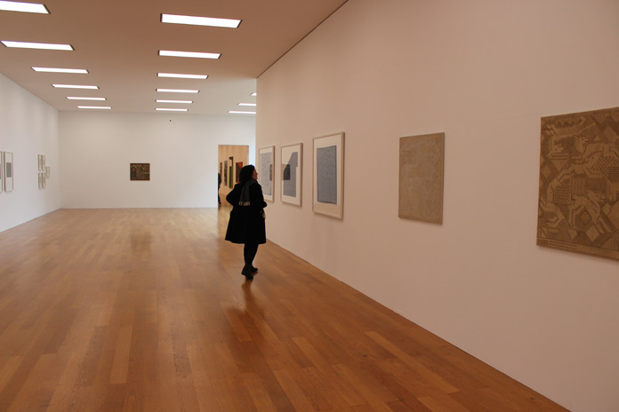 Quindi proseguiamo la visita scoprendo autori come Ferdinand Nigg e le sue realizzazioni a punto croce, miniature simbolo di bellezze antiche, che enfatizzano cicli eterni come “gocce di pioggia nell’oceano”, per usare le sue stesse parole. Le sale si snodano davanti a noi tra arte astratta e minimale, arte concettuale e arte povera, che attinge a piene mani al simbolismo, futurismo e surrealismo. Troviamo autori come Joseph Beuys e Anna Oppermann, con la sua Dahlie, opera vero organismo vivente che si protrae verso di noi con il suo carico di quotidianità.