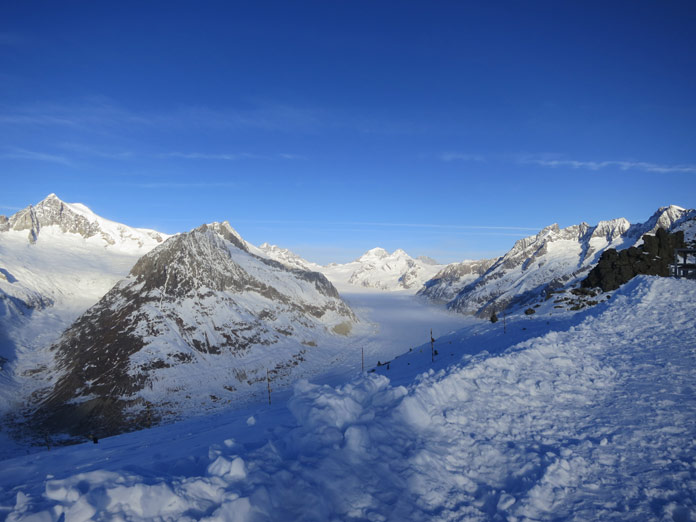Raggiungiamo i 2869 m d’altitudine, e restiamo letteralmente incantati e folgorati dalla bellezza millenaria di questo bianco gigante che misura 23 km e si estende dalla regione della Jungfrau (4000 m) fino ai 2500 metri di altitudine della gola della Massa, coprendo una superficie di 86 kmq.